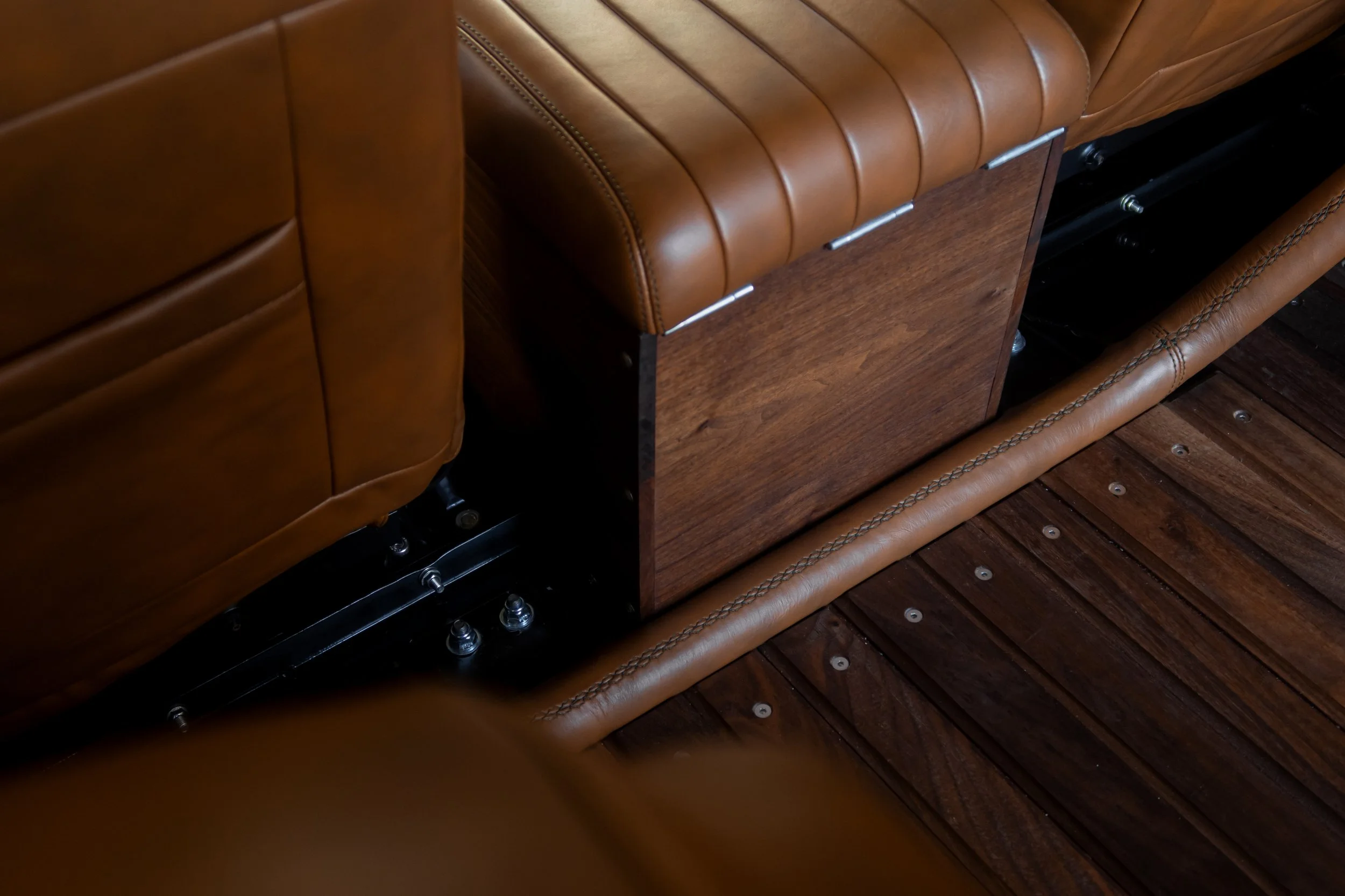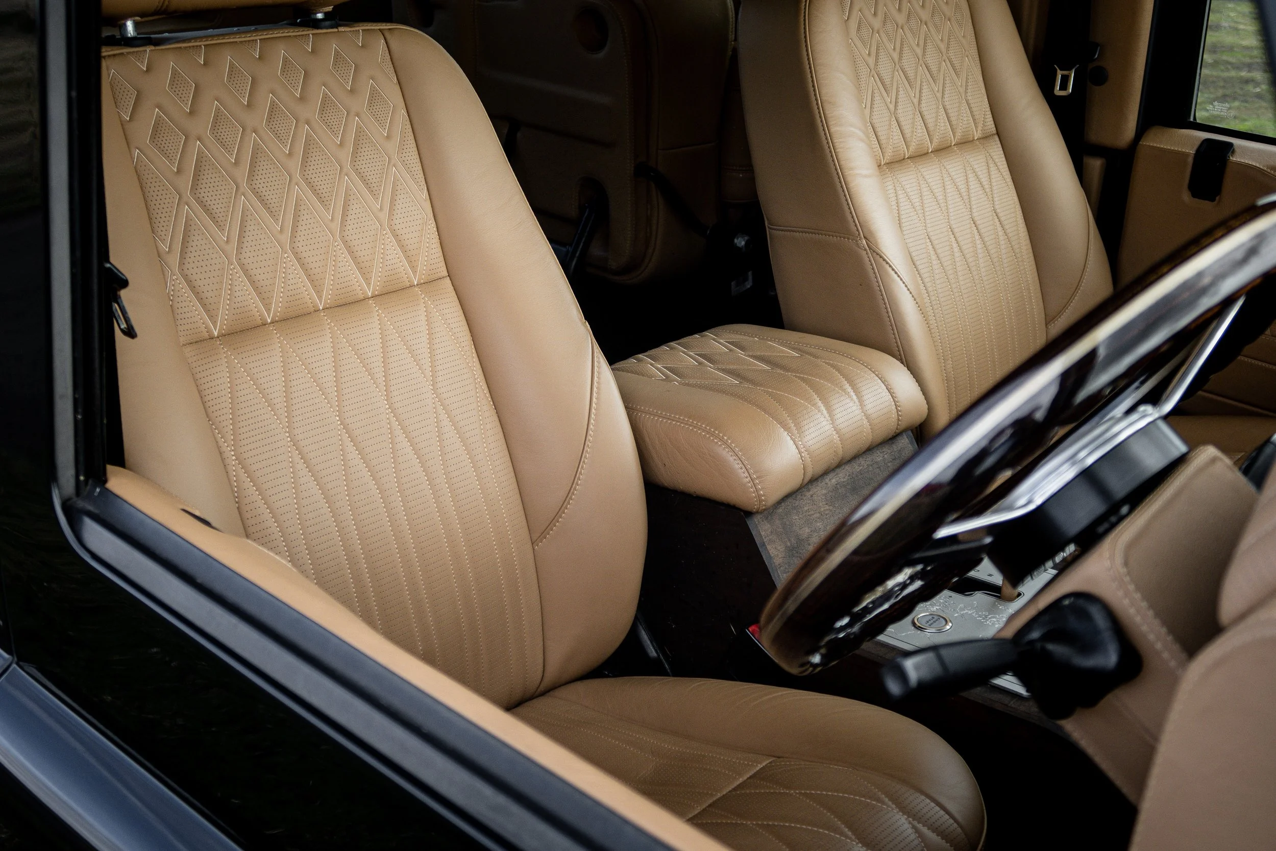Portfolio 1 shows some of the details from early outlander build projects. The emphasis with these projects was on trying to get away from the prevalent style of the time, which was black/ grey bodywork with bucket seats and big alloys. The objective was to explore a more authentic feeling methodology that reflected the original character of the Defender. The quality of durability of the constituent materials was also of key importance.