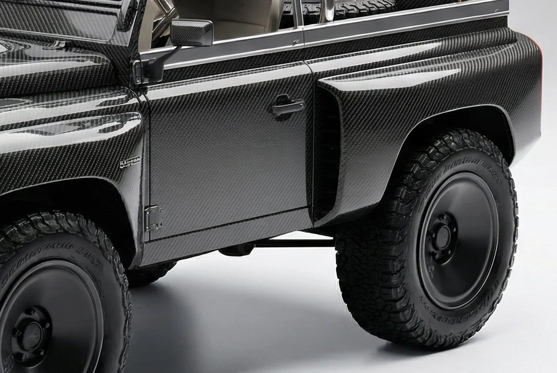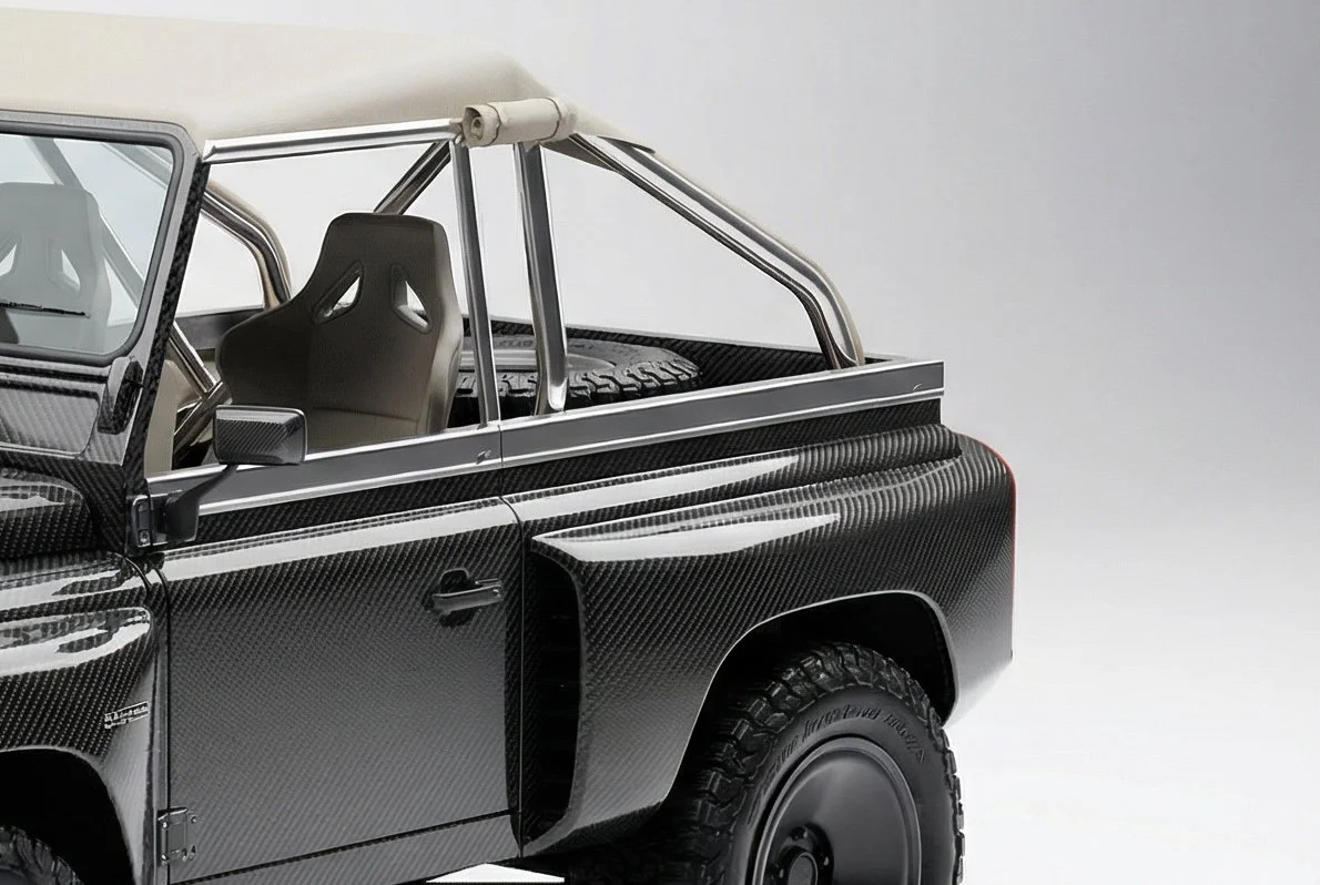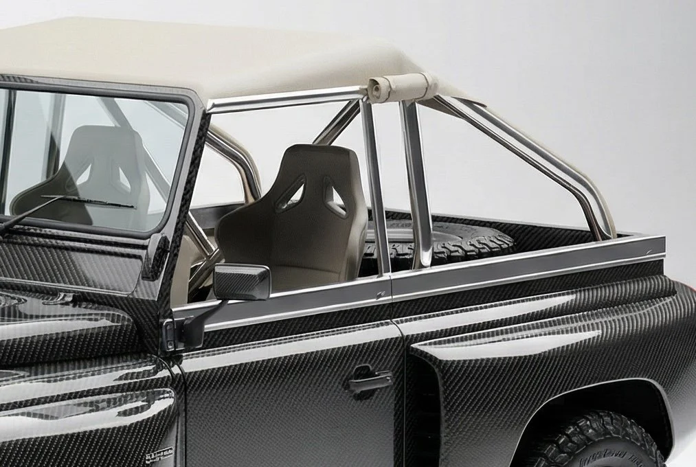 the original roll hoop was redesigned with a bespoke, purpose made item. Every other part on the vehicle was redesigned and developed specifically for this Defender. Many new elements were designed and then filters through to the other lines of Defenders. This includes elements such as the bonnet louvres, bluetooth music system, Wenge hardwood, woven leather seats, CrispShift gearsticks, etc.